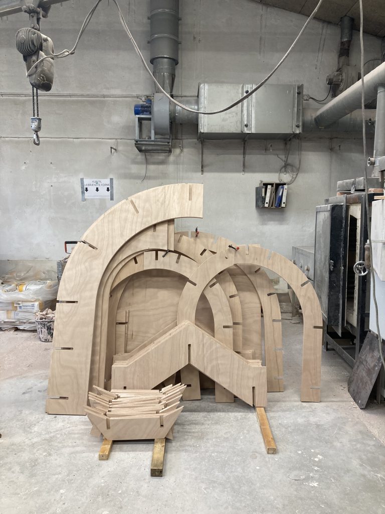 3. Construction of two installations that can test the development of the woolen buildingblocks. VAK Jyderup, DK. Pieces cutted by CNC in 250×122 in Okouplex, FSC