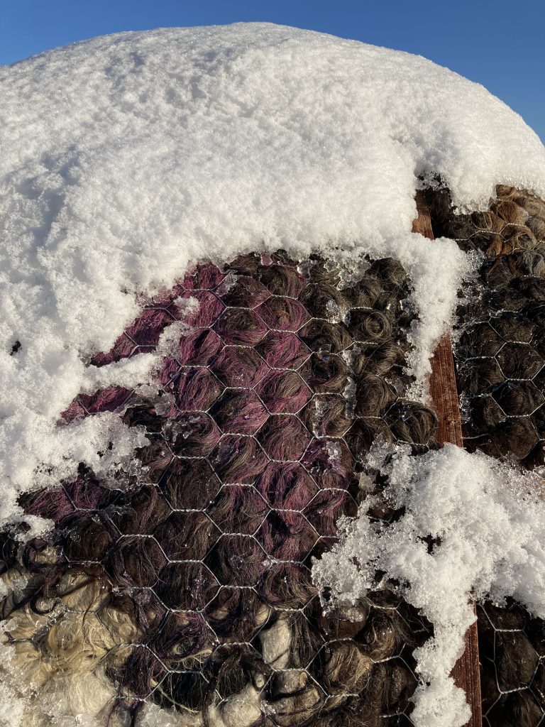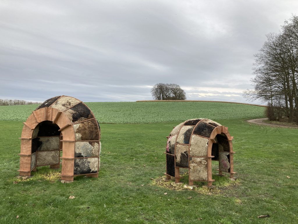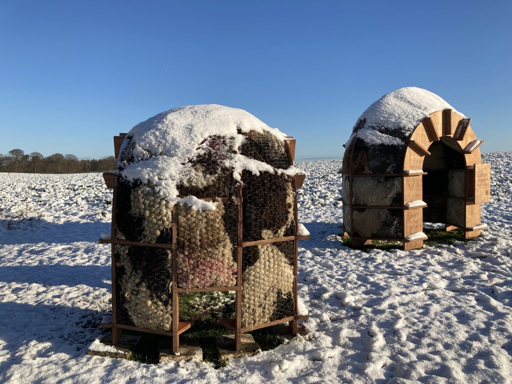Design; Test, two diverse installations of woolen buildnigblocks made with two different metal frontcovers. Tested at Trudsstrupgods, Rye DK, from the 04.12.2021