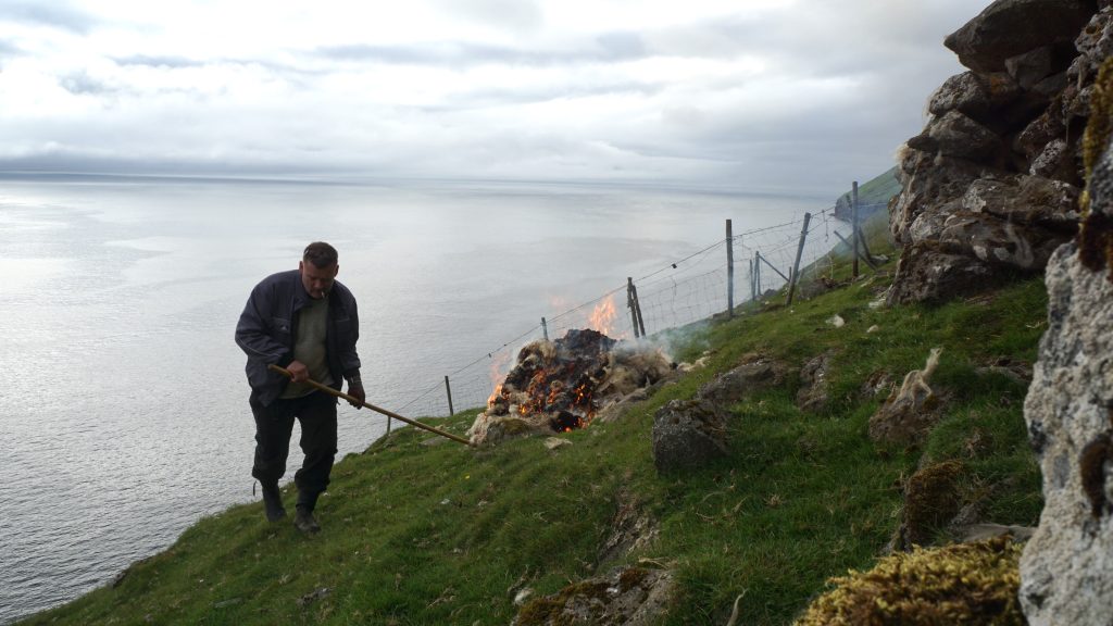 Field work; Observation of yearly burned pile of  Faroe Sheep wool, Kalsoy, FO.